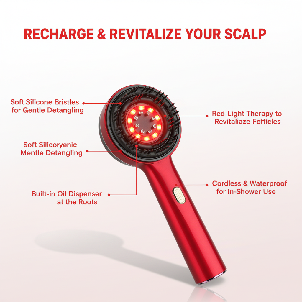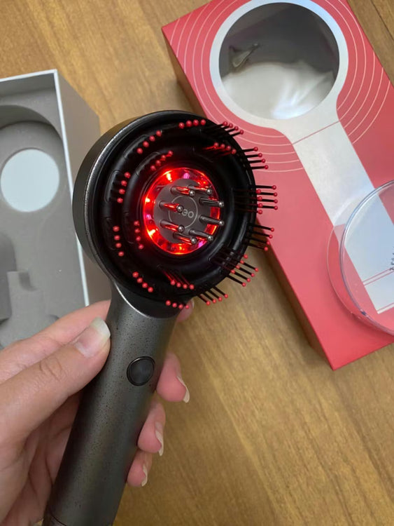 Dual comb-brush for detangling and massage Steady vibration and EMS pulses for circulation Red light and oil reservoir to nourish follicles